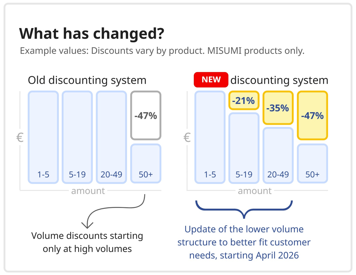 * Only affects MISUMI brand products. Discounts vary by product and quantity and will appear in the pricing section of the product detail webpage when applicable.